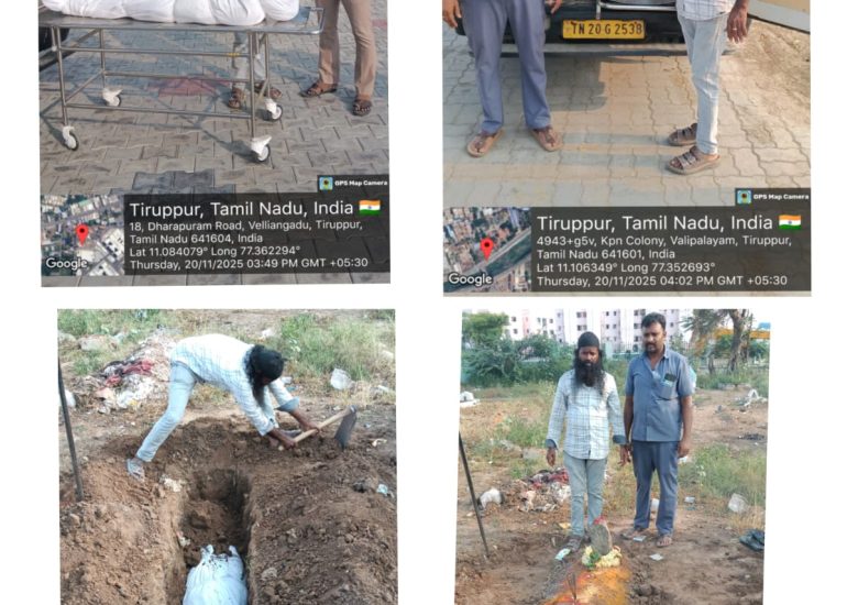 02:12:2025. இன்று இரண்டு ஆதரவற்ற உடல்கள் அடக்கம் செய்து கொடுக்கப்பட்டது சுமார் 55 வயது மதிக்கத்தக்க பெயர் விலாசம் தெரியாத ஆண் மற்றும் 50 To 55.வயது மதிக்கத்தக்க பெயர் விலாசம் தெரியாத ஆண் இருவருக்கும் உறவினர்கள் யாரும் இல்லாத காரணத்தால்